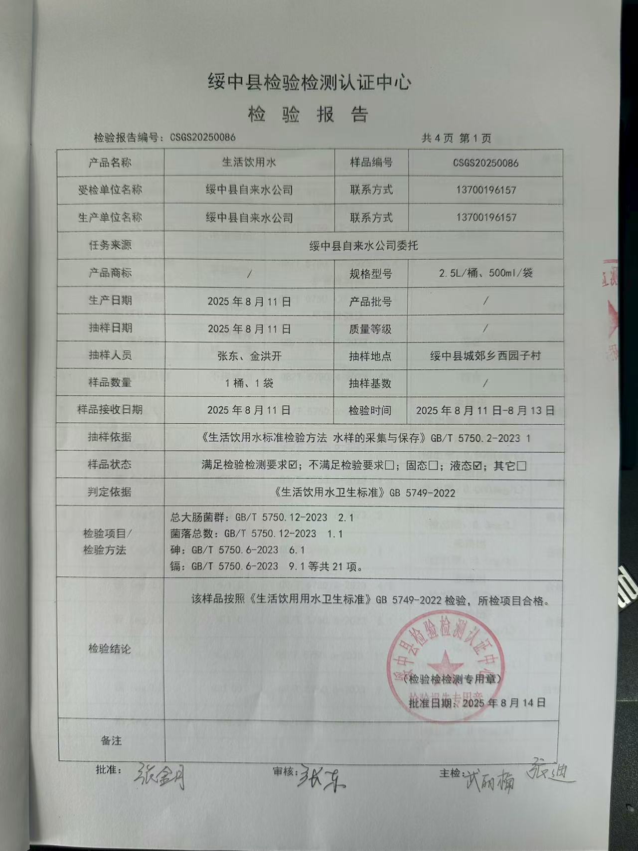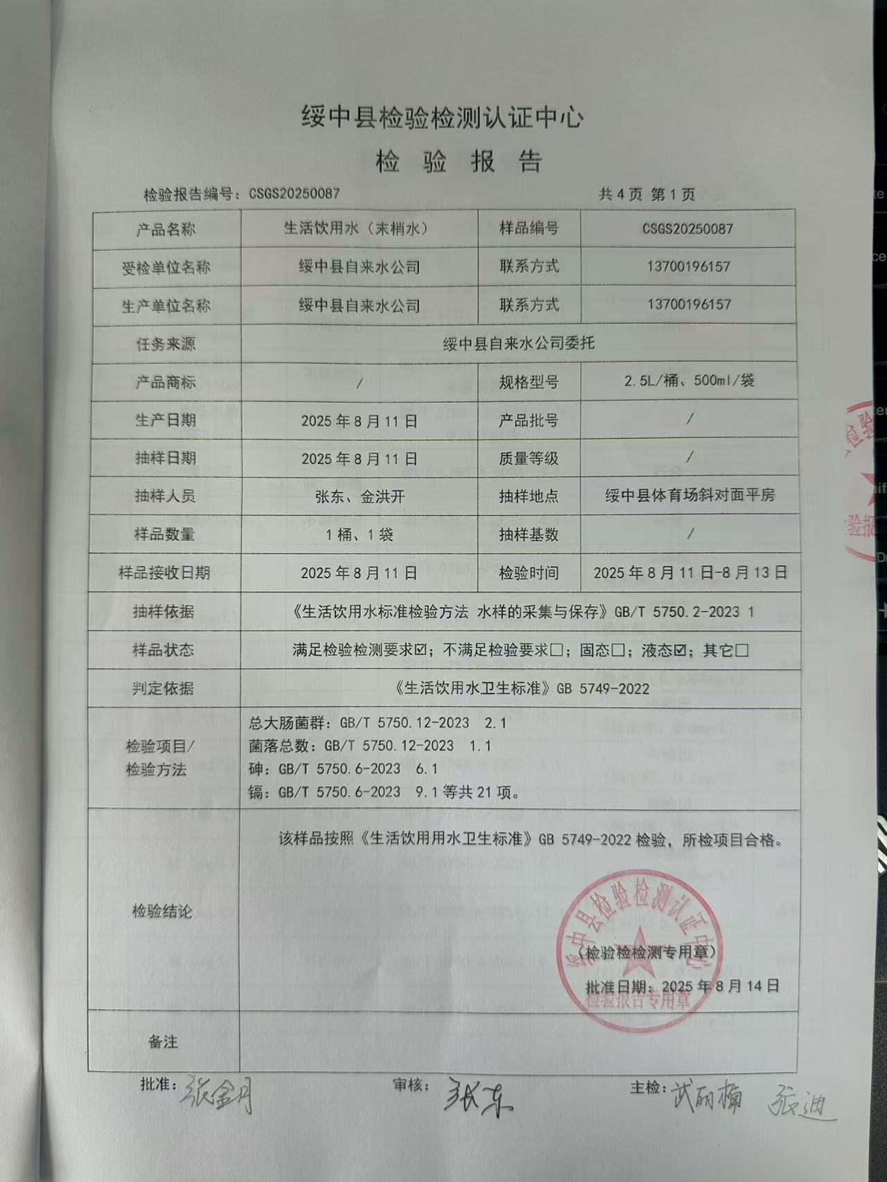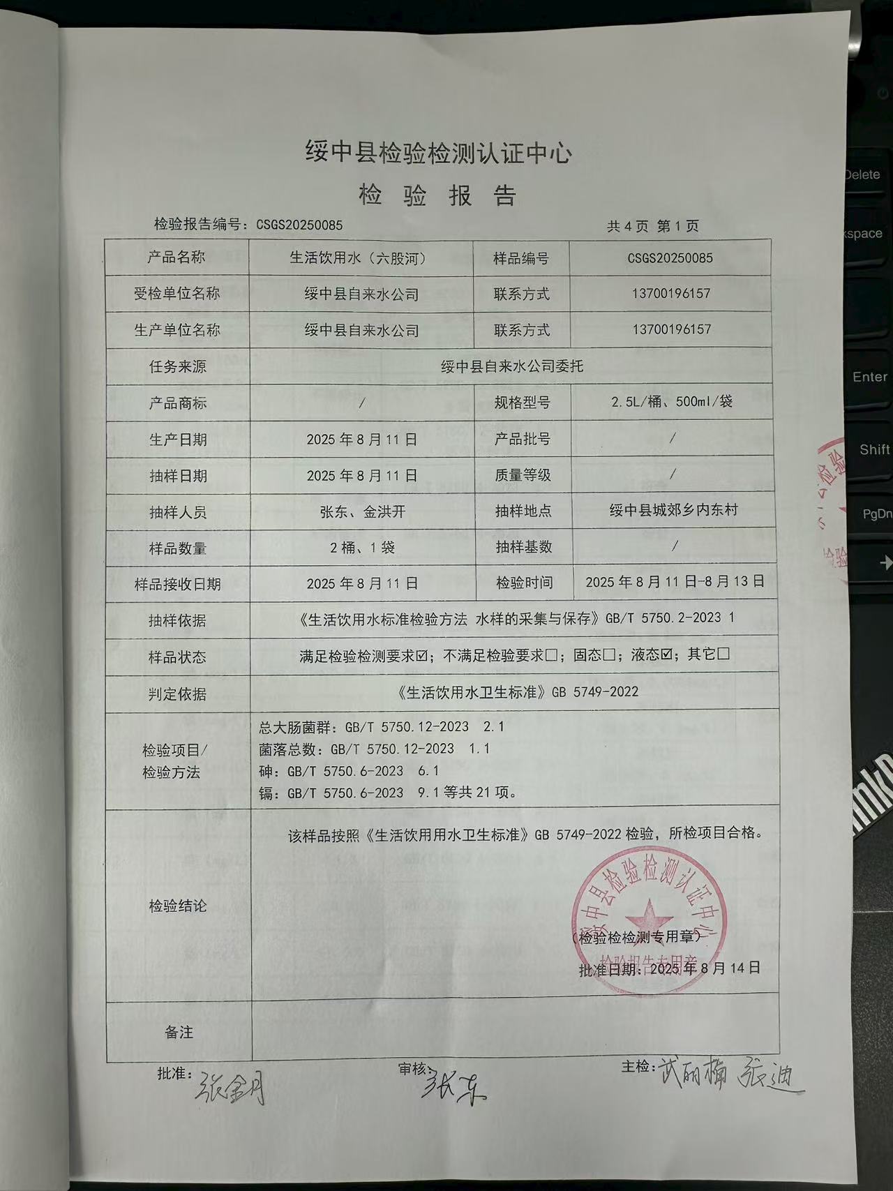 2025年8月14日水質(zhì)報(bào)告
